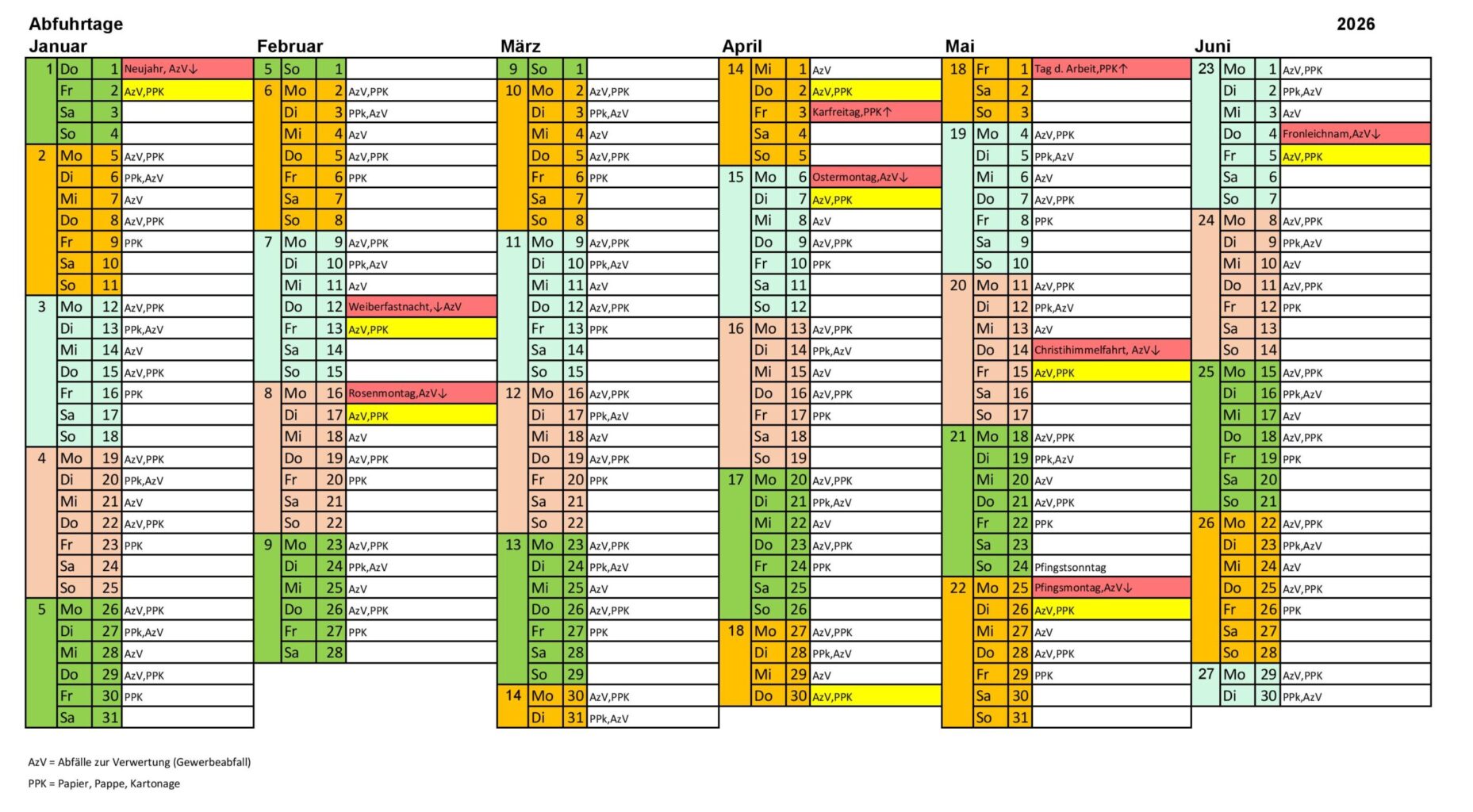 Manchmal sind auch Vorverlegungen möglich (Freitag wird zu Donnerstag, usw.). Entscheidend für die Abfuhr durch uns ist der Blick auf unseren Abfallkalender. Wenn Sie den regulären Abfuhrtag Ihrer Tonnen kennen, schauen Sie einfach in den Kalender. Sollten Sie Ihren Abfuhrtag nicht kennen, schreiben Sie uns eine Mail oder rufen Sie uns an.