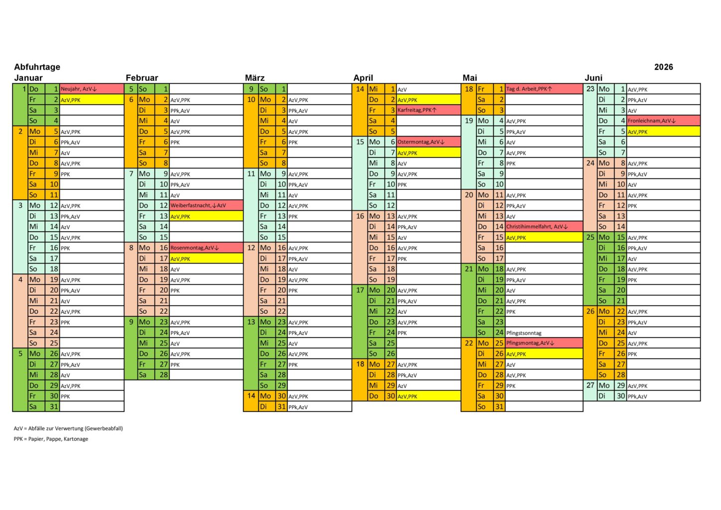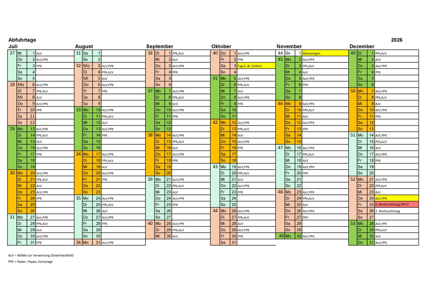 Manchmal sind auch Vorverlegungen möglich (Freitag wird zu Donnerstag, usw.). Entscheidend für die Abfuhr durch uns ist der Blick auf unseren Abfallkalender. Wenn Sie den regulären Abfuhrtag Ihrer Tonnen kennen, schauen Sie einfach in den Kalender. Sollten Sie Ihren Abfuhrtag nicht kennen, schreiben Sie uns eine Mail oder rufen Sie uns an.